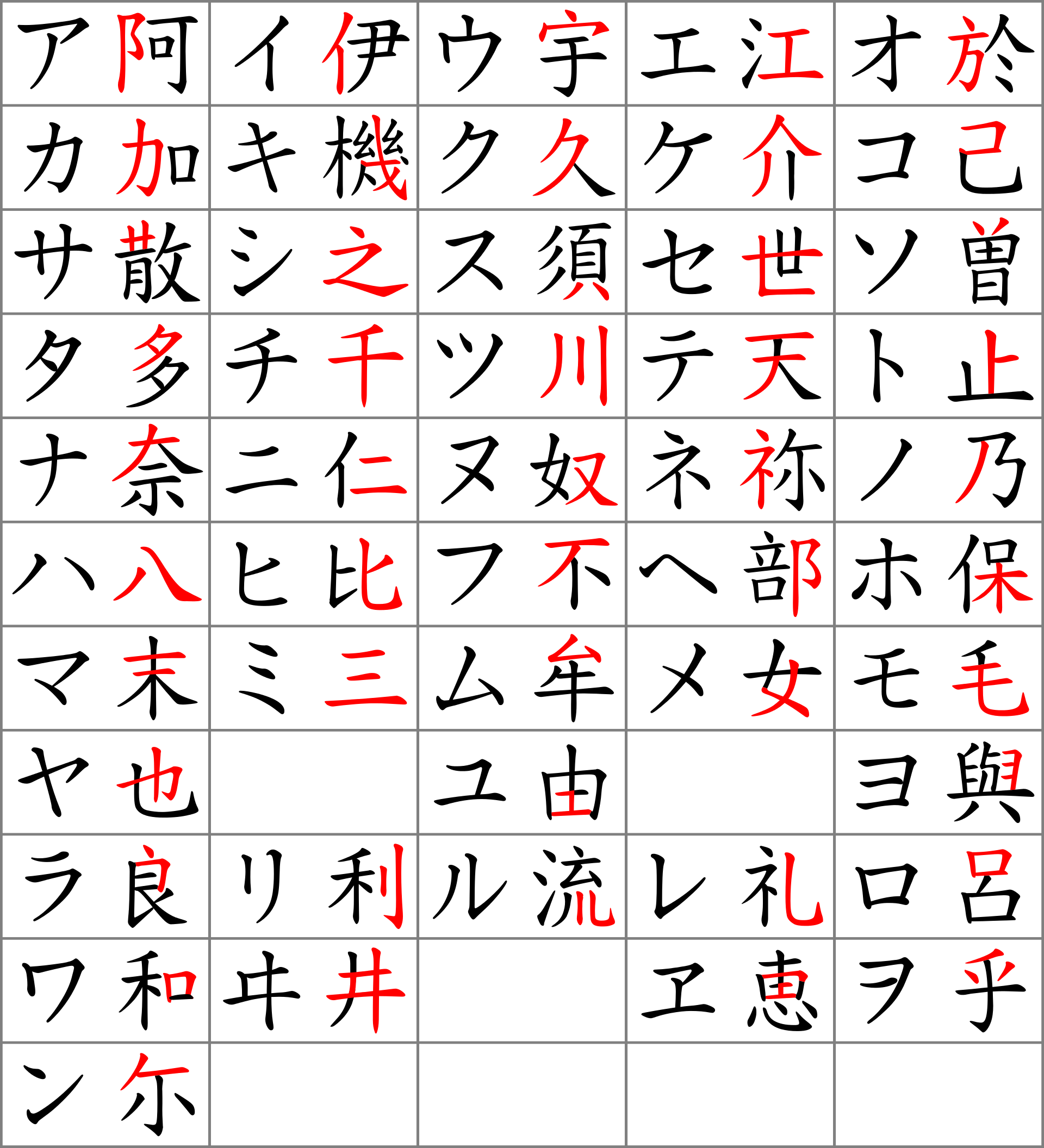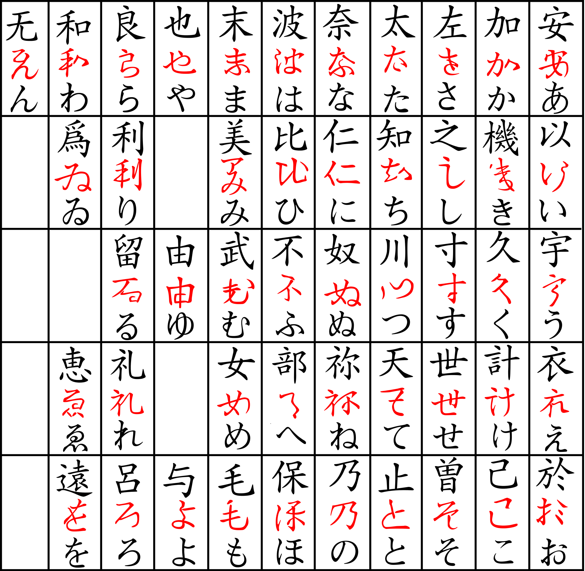 平假名:源自漢字草書。有些假名還可以看出有一點漢字的影子。